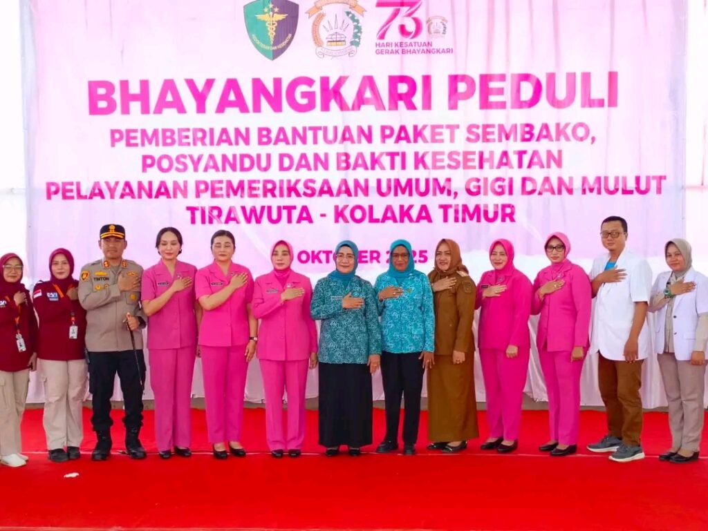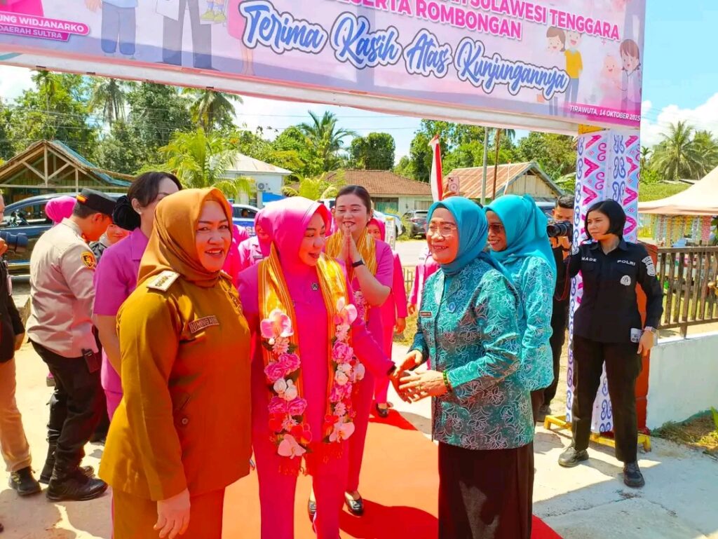 Kolaka Timur, OBORSULTRA.ID — Ketua Bhayangkari Daerah Sulawesi Tenggara, Ny. Yani DA Widjanarko, didampingi Wakil Ketua Bhayangkari, Ny. Luciana Gidion, bersama jajaran pengurus Bhayangkari Sultra, melaksanakan kunjungan kerja ke Kecamatan Tirawuta, Kabupaten Kolaka Timur, Selasa (14/10/2025). Kunjungan ini merupakan bagian dari program Bhayangkari Peduli, yang mengusung kegiatan sosial dan pelayanan kesehatan bagi masyarakat.
