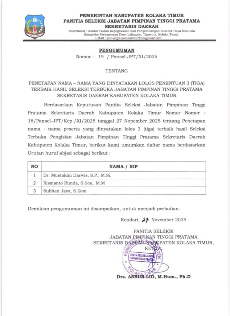 Ketiga nama ini akan diajukan kepada Pejabat Pembina Kepegawaian untuk proses penetapan Sekda Kolaka Timur. (Tim).