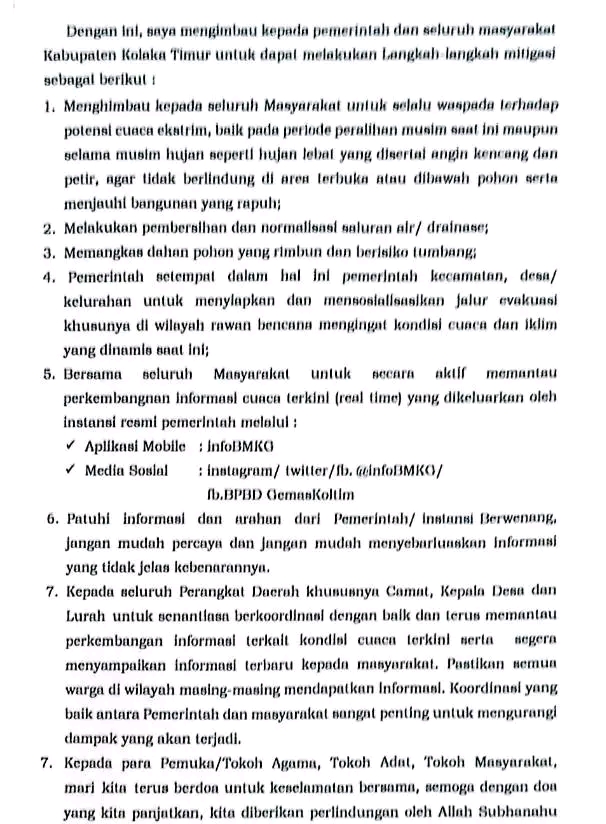 Dalam imbauannya, Plt Bupati Yosep Sahaka menegaskan perlunya langkah mitigasi di setiap kecamatan dan desa. Ia meminta masyarakat untuk lebih proaktif dalam menjaga lingkungan, terutama di area yang rentan banjir dan longsor.